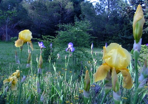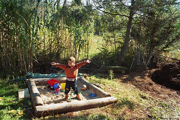 | Sandkasten im hinteren Teil des Gartens, dahinter Steinbank / Le bac à sable dans un coin du terrain | Lilienfeld im Garten im Mai / Iris fleuries en mai