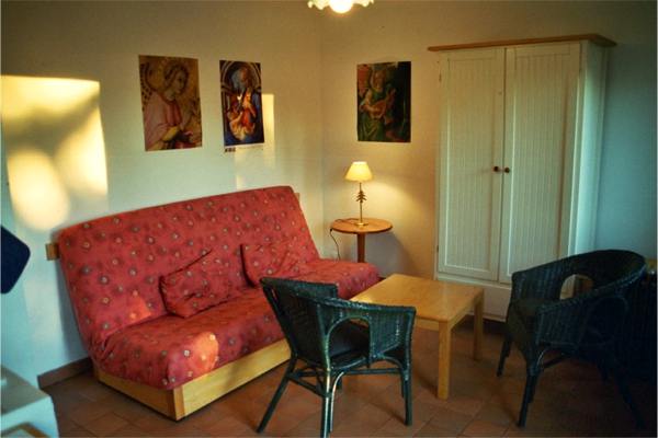 Im Ferienhäuschen: Sitzecke und Bettcouch (ausgeklappt 140 x 200 cm). Links davon befindet sich ein kleines, separates Bad (Dusche und WC, nicht im Bild) / Coin "salon" du studio avec canapé-lit (140 cm x 200 cm). à gauche il serait un cabinet avec toilette et douche |